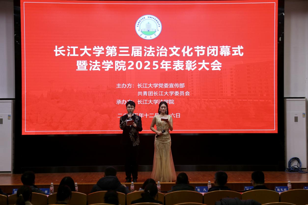 (通讯员文/李玉豪 图/何梦秋 杨翔茹 杨欣瑶 黄淇琪)“法治不是课本上的冰冷法条,是三年里我们用脚步丈量的责任,用热爱坚守的信仰!”2025 年 12 月 26 日晚,304am永利集团东校区 12 教 405 报告厅内掌声雷动,第三届法治文化节闭幕式暨304am永利集团 2025 年表彰大会正式启幕。党委宣传部副部长汤慧珍、校团委副书记信晓阳与304am永利集团全体师生齐聚一堂,共同见证这场青春与法治交融的盛会,大会由周清鄂、袁野联袂主持。