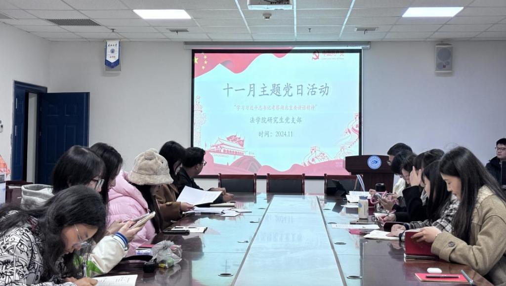 随后,11月支部主题党日活动在庄严的入党宣誓声中正式拉开帷幕。主持人田博文同志带领全体党员同志重温了入党誓词,并深入学习了《中国共产党章程》,共同回顾了党的光辉历程与伟大成就。同时,大家还认真学习了习近平总书记在湖北考察时的重要讲话精神,深刻领会其核心要义与实践要求。在主题研讨环节,方瑞、张润礼等党员同志积极发言,分享了自己的学习心得与体会。方瑞同志从法学专业角度出发,探讨了如何将重要讲话精神融入法治实践,为推进全面依法治国贡献智慧与力量;张润礼同志则着重分享了如何将重要讲话精神转化为实际行动,以更加饱满的热情、更加扎实的作风投入到学习和工作中去,为实现中华民族伟大复兴的中国梦贡献青春与汗水。