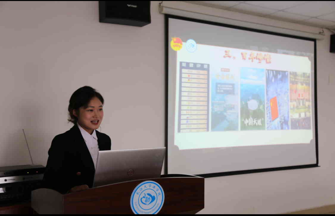 优秀团员代表孔淑伊、王梦苑、杨婉婷以“微故事”形式分享团史中的动人片段与身边团员的先进事迹。她们以小见大的讲述,串联起共青团与党同心、跟党奋斗的光辉历程,让在场青年真切感受到信仰传承的力量。随后,叶倩同学以《青春心向党,奋进新征程》为题的主题演讲将活动推向高潮,她以饱满的激情、鲜活的事例,展现了新时代法学青年 “以青春之我、建青春之功” 的责任担当,引发全场共鸣。