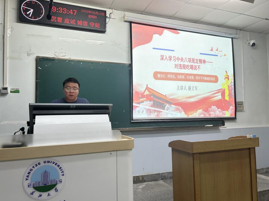 最后,支部书记盛文军进行讲党课,他强调要深入贯彻中央八项规定精神,牢记党员身份,对违规吃喝歪风说不。并对会议进行了总结,他表示党员同志要深刻学习三大精神所蕴含的艰苦奋斗、众志成城与生命至上的内涵,并将其践行于学习生活之中。