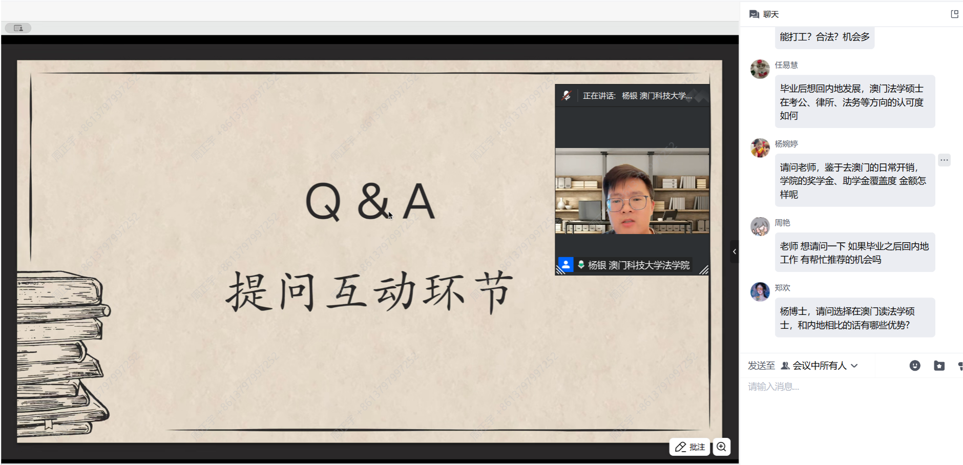杨银博士结合自身在澳门科技大学的求学、研究及教学经验,用通俗易懂的语言,围绕澳门高校法学教育概览、法硕申请条件、培养方案、申请流程、学费及奖助学金等核心内容展开细致讲解。他重点介绍了澳门科技大学、澳门大学等主流高校的法学学科优势,以及其依托粤港澳大湾区在国际法等领域的特色培养方向;明确了本科专业、GPA、语言能力等申请门槛及跨专业申请要点;详解了学制、课程体系、实践安排及论文答辩要求,拆解了申请全流程及时间节点,并说明学费标准与各类奖助学金的申请条件、额度,为同学们清晰勾勒出澳门法学硕士申请与就读的完整图景,解答了前期诸多基础疑问。